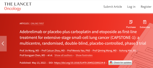 北京时间2022年5月14日,AG视讯医药自主研发的PD-L1抑制剂阿得贝利单抗治疗广泛期小细胞肺癌的III期临床研究(CAPSTONE-1研究)成果正式全文在线发表于国际权威学术期刊《柳叶刀·肿瘤学》(《THE LANCET Oncology》,影响因子41.316)。CAPSTONE-1研究结果显示,阿得贝利单抗联合化疗一线治疗广泛期小细胞肺癌相较于安慰剂联合化疗可以显著延长患者总生存期至15.3个月[1],刷新现有免疫药物一线治疗广泛期小细胞肺癌的总生存纪录[2]